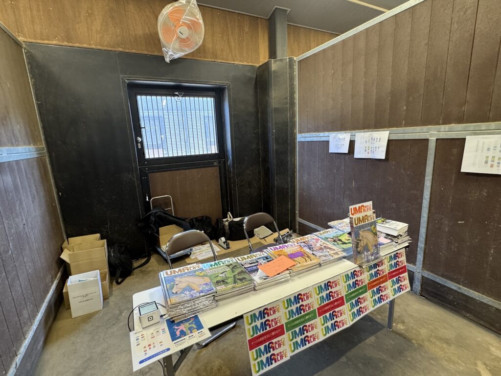一方で馬房を利用したブースエリアは底冷えがします。暖房がないので外にいたほうが温かいほど。馬ライフの加茂田編集長や土井部長、FRCの田中代表らと交代で休憩を取りながら来客対応しました。多くのお客さんや乗馬関係者の来場があり、かなり具体的なビジネスの話などもありました。